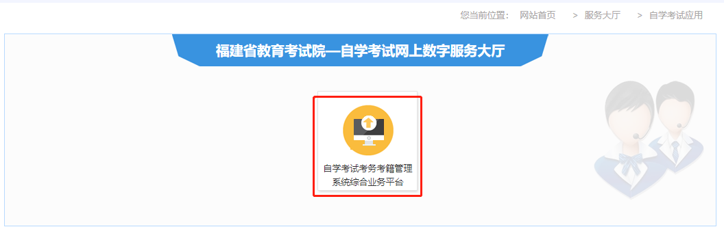 1.进入“福建考试教育院”网站,选择右侧“数字服务大厅”中的自学考试并点击进入“自学考试考务考籍管理系统综合业务平台”;